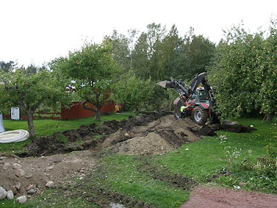 Helgen ägnats åt att försöka få ordning på dräneringen i husets sydvästra hörn. Inne i källaren är det alltid blött efter regn och numera förstår vi varför...